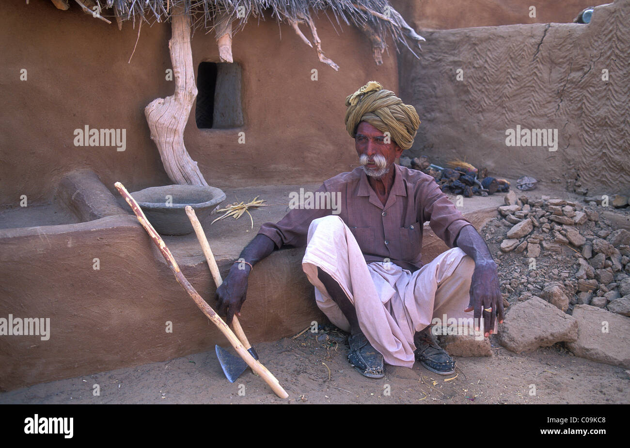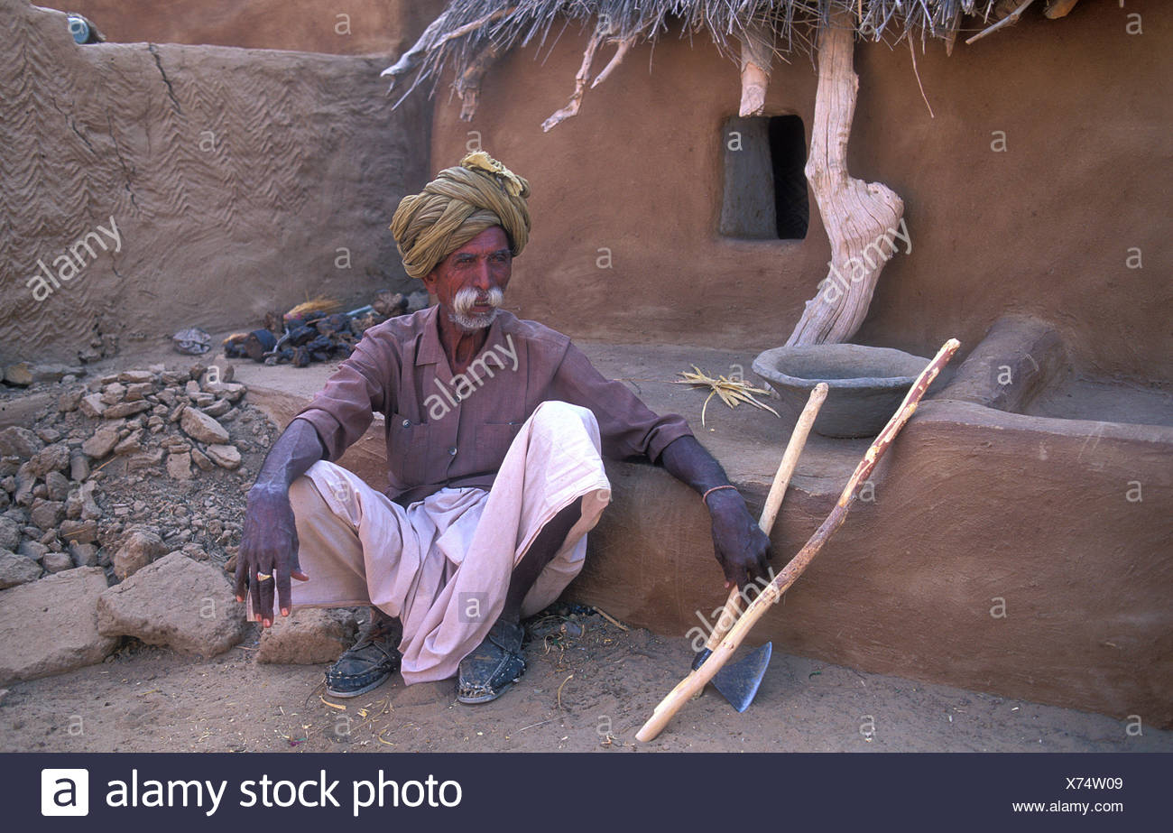 old man working in front of his house wearing a turban and a dhoti the traditional men s garment thar desert rajasthan stock photo alamy