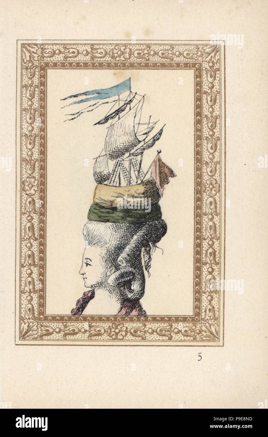 frau tragt ein modell schiff in ihr haar inspiriert von belle poule eine marine fregatte die sich im kampf im jahre 1778 ausgezeichnet coiffure a la belle poule handkoloriert lithographie von de