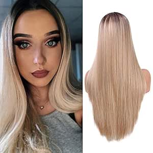 ymhpride ombre blonde lange gerade perucken fur frauen naturlich aussehende synthetische mittelteil haarperucke halbe hand gebunden hitzebestandige faser 22 zoll amazon de beauty